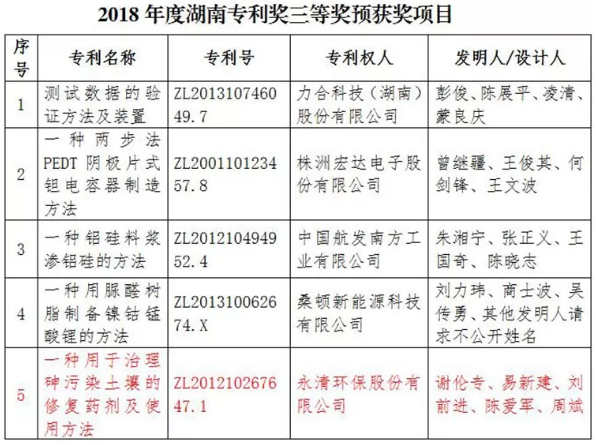 近日,湖南省專利局公示2018年度湖南專利獎評審結(jié)果,永清環(huán)保發(fā)明專利《一種用于治理砷污染土壤的修復(fù)藥劑及使用方法》(專利號:ZL201210267647.1)獲湖南省專利獎三等獎。 本發(fā)明的目的在于克服現(xiàn)有技術(shù)的不足,創(chuàng)新提供一種原料來源廣泛、制備簡單、操作使用方便、效率高、治理效果好的,用于治理...