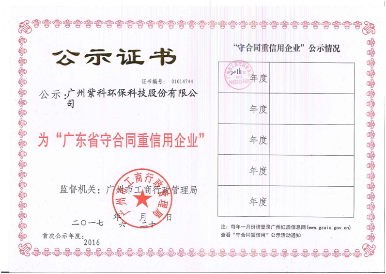 助力經(jīng)濟(jì)可持續(xù)發(fā)展 紫科環(huán)保獲2016年度“廣東省守合同重信用企業(yè)”稱號(hào)