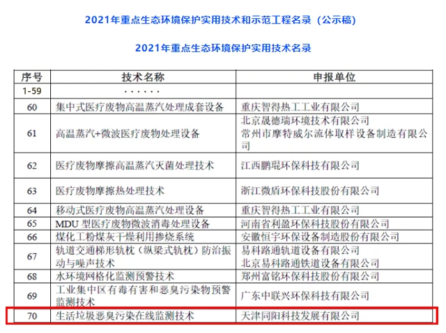 喜訊!同陽科技入選2021年重點(diǎn)生態(tài)環(huán)境保護(hù)實(shí)用技術(shù)名錄